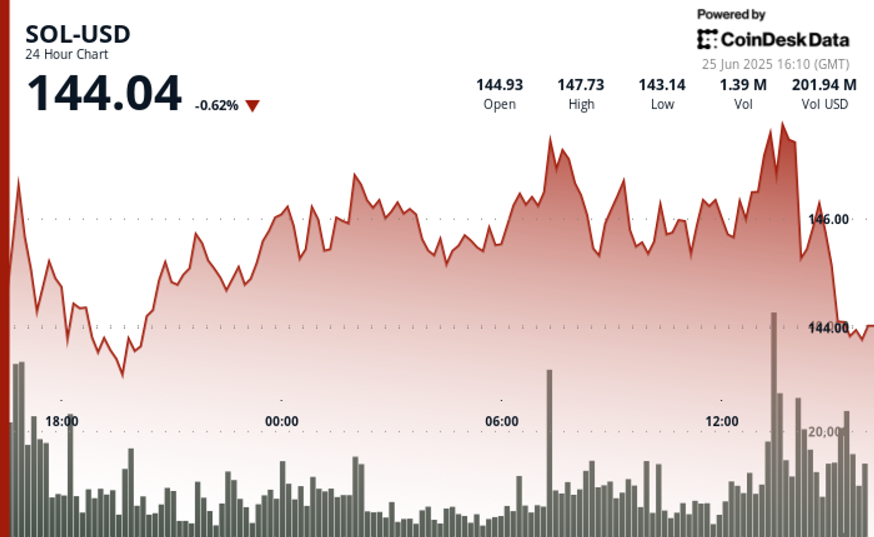 token is trading at $144.04, down 0.62% in the past 24 hours, after briefly climbing as high as $147.73 earlier in the session, according to CoinDesk Research’s technical analysis model.